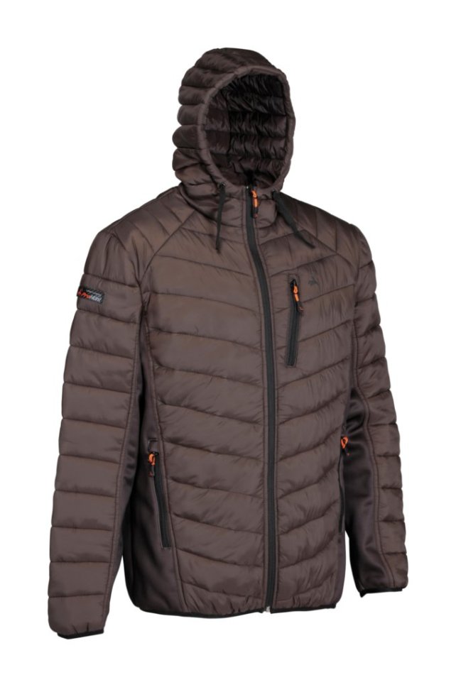 Doudoune bi-matière à capuche marron foncé - 100% polyamide, côté 100% polyester, garnie de fibres douces. 2 poches basses, 1 poche poitrine.